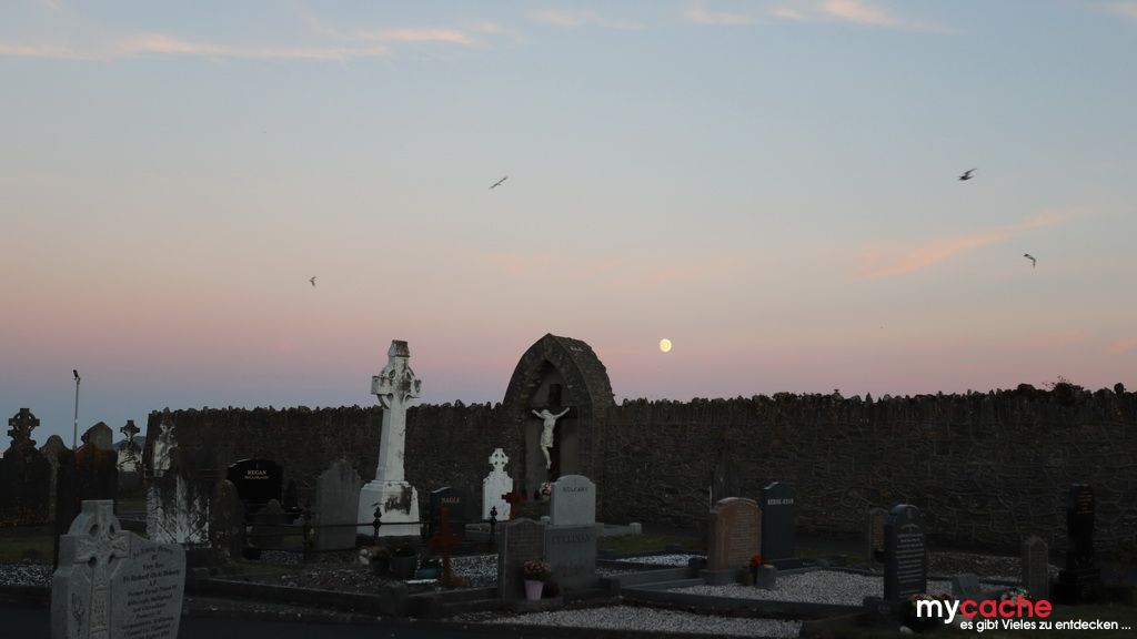 Wir werden vom strahlenden Sonnenaufgang geweckt. Nach dem ausgiebigem Frühstück brechen wir auf nach Brave Head zu einer Fundstätte fossiler Fußabdrücke. In Portmagee nehmen wir die Brücke zur Insel Valentia hier erkunden wir die Ruinen zweier Kirchen mit Friedhöfen, die noch genutzt werden. Beim Anfahren weiterer Aussichtspunkte treffen wir nun immer auf Höhenbeschränkungen von 2,1 Meter und haben somit meist keine Chance unseren „Kleinen“ zu parken. Die Suche nach einem geeigneten Übernachtungsplatz wird durch starken Regen und einbrechende Dunkelheit zum kleinen Abenteuer. Schließlich nehmen wir die Nachtfähre von Tarbert nach Killimer über den Shannon River. Wir übernachten in der Marina von Kilrush.