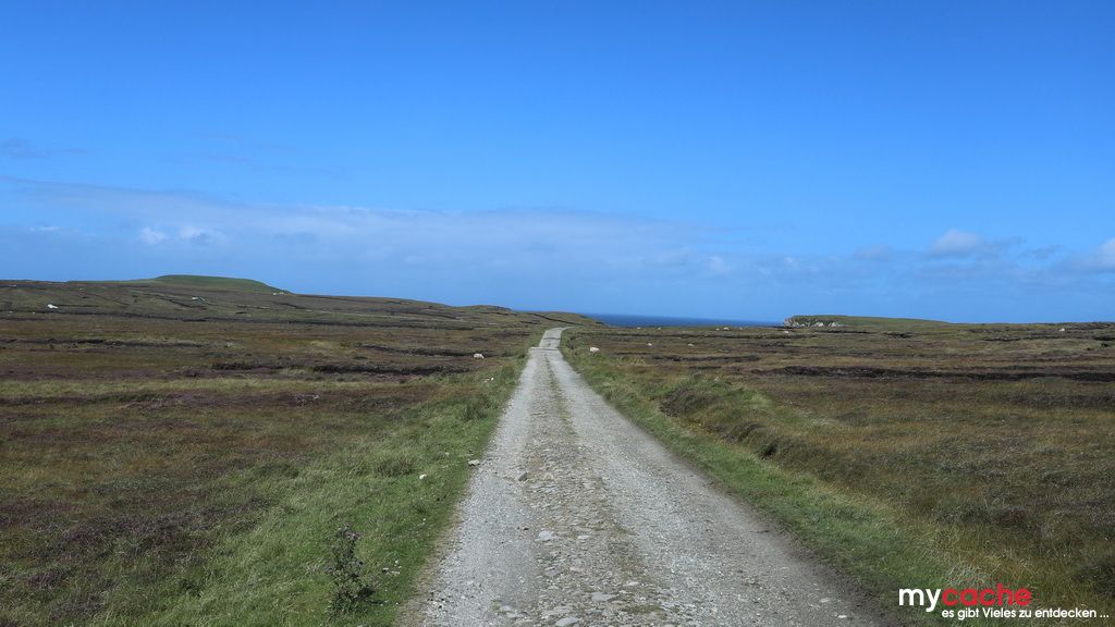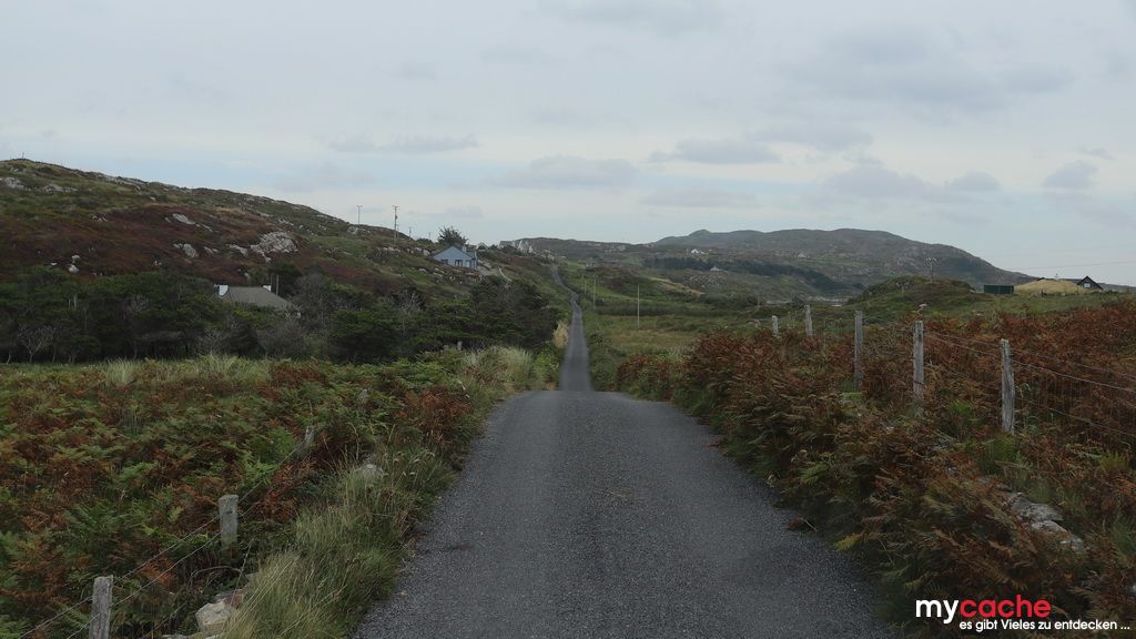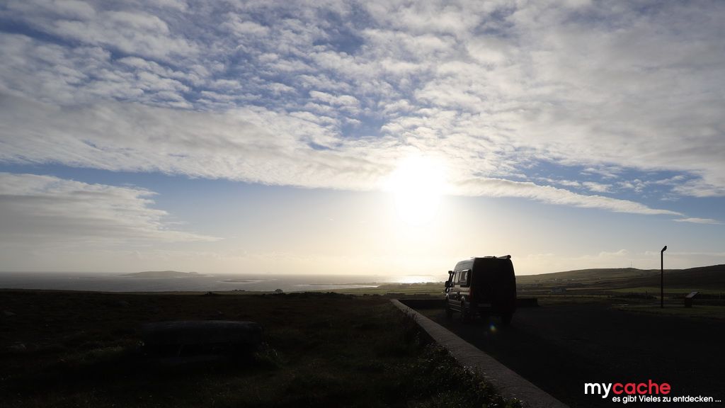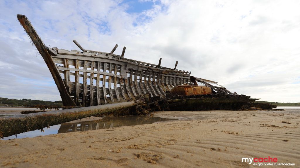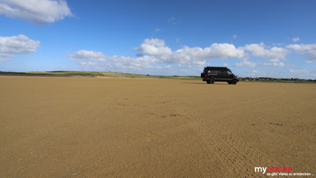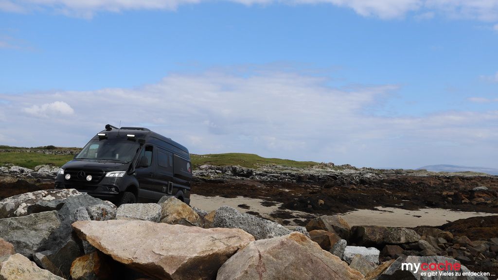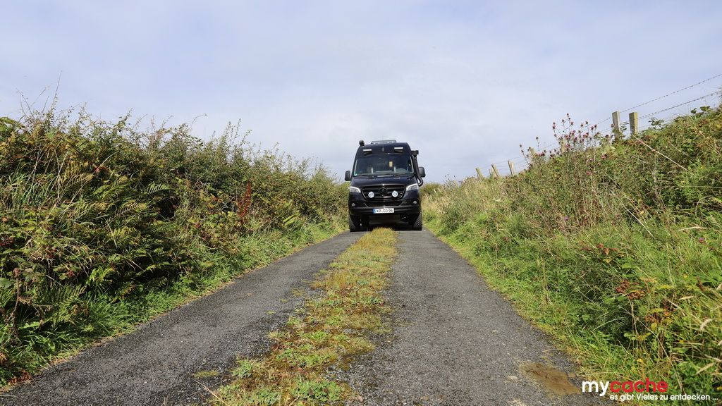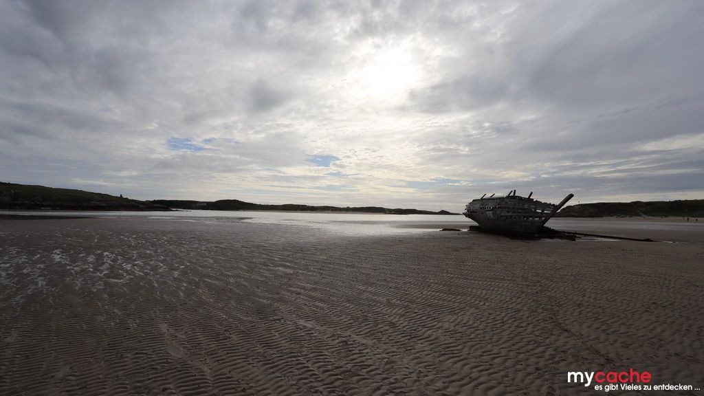 Heute hat der Track Ähnlichkeiten mit einer Achterbahn. Wir befahren schmale kurvenreiche einspurige Tracks mit Blind Hills und kleinen Brücken. Am Strand von Bun Beag können wir aufgrund der Ebbe zur vorgelagerten Insel wandern und dort einen Geocache loggen. Auf dem Rückweg erkunden wir das Schiffswrack eines in den 70er Jahren gestrandeten Holzboots. Die Nacht verbringen wir am Horn Head.