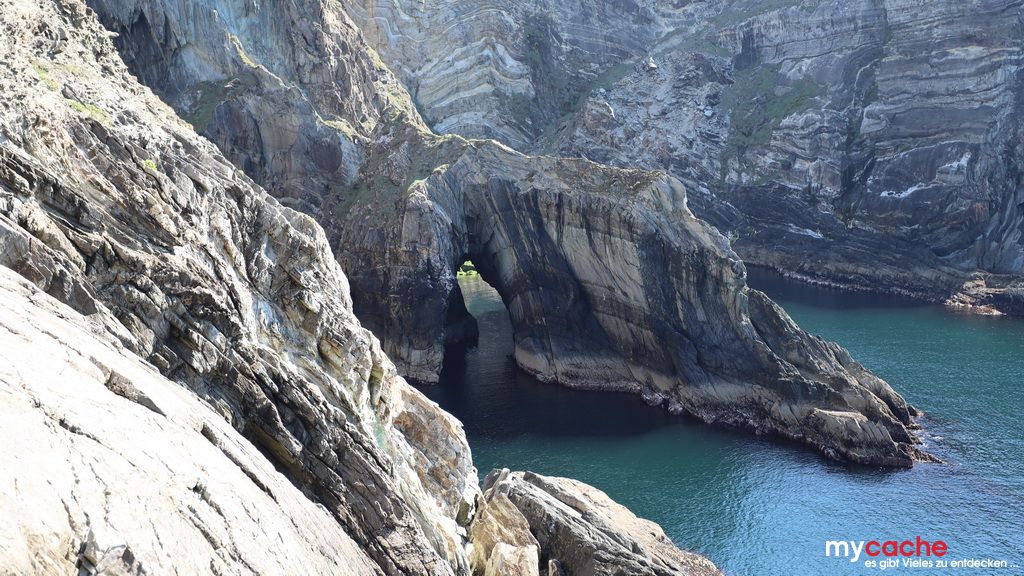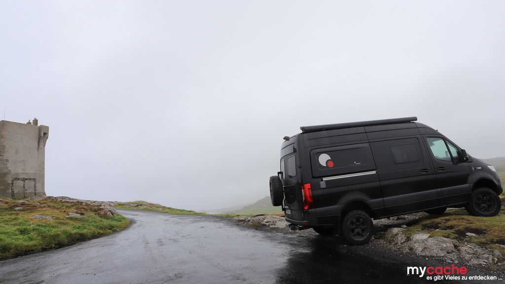 Der Tag beginnt typisch irisch mit düsterem Himmel und ordentlich Wind. Nach dem Frühstück erkunden wir Horn Head und wandern durch Heidekraut bis zur Ruine am Gipfel. Auf dem weiteren Weg nach Norden besuchen wir Doe Castle, welches sich in einem überraschend guten Zustand befindet. Nun wissen wir auch was die Milch von irischen Kühen so besonders macht, sie relaxen gerne einmal am Strand. Das Highlight des Tages ist Great Pollet Arch in zweierlei Hinsicht. Zum ersten ist dieses Brandungstor sehr beeindruckend und zweites setzt der Starkregen genau ein, als wir wieder am Sprinter angekommen sind. Bei bleibendem Regenwetter fahren wir bis nach Binion Bay..