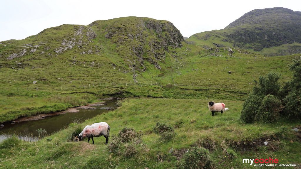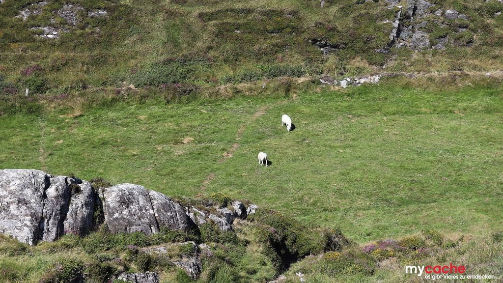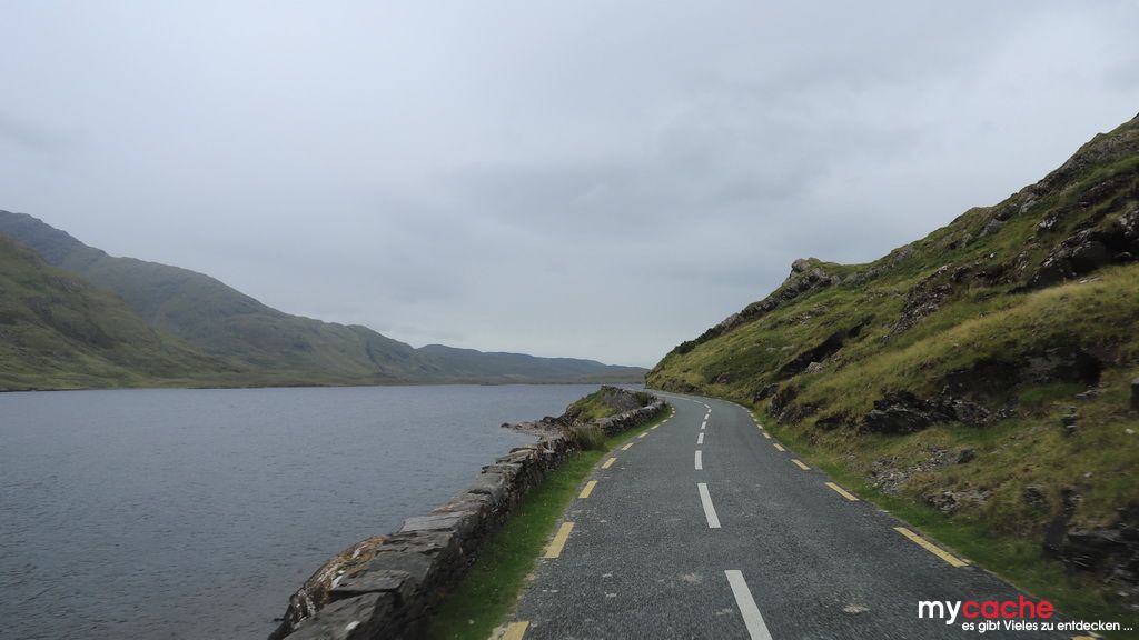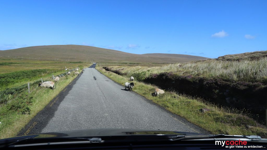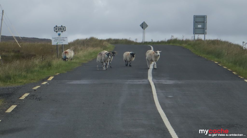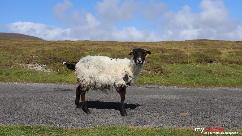 Der Tag startet - wie im Wetterbericht angekündigt - mit Sonne und blauem Himmel. Wir folgen der Sky Road, die sich auf 12 km Länge den Himmel hinaufschraubt. Am gleichnamigem Aussichtspunkt angelangt, folgt das Wetter nicht mehr der Vorhersage und es beginnt zu regnen. Wir folgen dem WAW (N) und passieren eine Landschaft, die uns stark an Schottland und die Faröer Inseln erinnert, sowohl optisch als auch wettertechnisch. Zwischen den Seen Lough Muck und dem Lough Fee verbringen wir unsere obligatorische Kaffeepause. Auf unserer Weiterfahrt begegnen wir immer mehr Schafen neben und auf der Fahrbahn. Die heutige Etappe endet auf den Achill Islands.