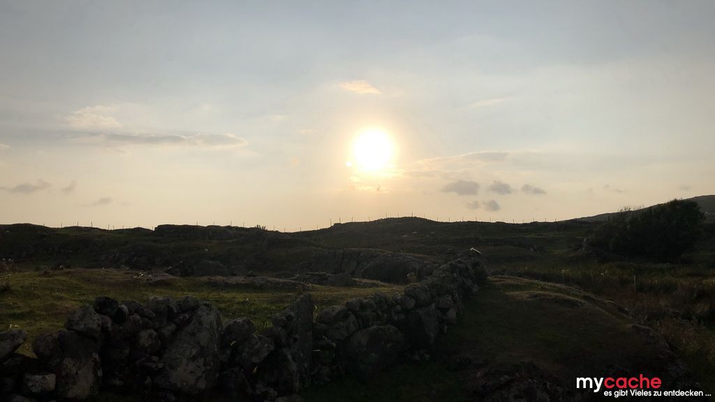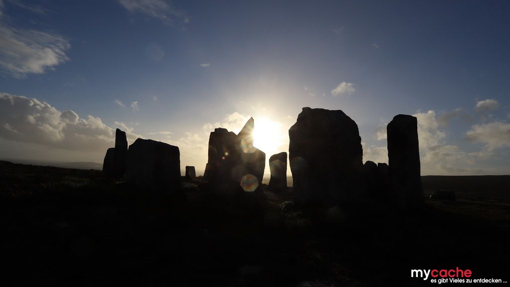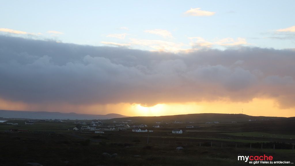 Auch heute hält sich das Wetter nich an die Vorhersage, es soll den ganzen Tag regnen und stürmen. Nach dem langen Frühstück brechen wir auf und es beginnt aufzuhellen und die Sonne kommt durch. Wir erkunden die Achill Islands entlang der Küstenstraße in Form einer Acht. Somit wechseln wir zum ersten Mal auf dieser Tour die jeweilige Sitzposition zum Wasser. Am Straßenrand entdecken wir ein Hinweisschild auf einen Steinkreis, den wir nach einigen Irrfahrten erreichen. Jedoch handelt es sich hierbei um eine Rekonstruktion aus Stahlbeton. Vom Aussichtspunkt Cuan na haisleime haben wir einen überwältigenden Blick auf die Klippen und die Serpentinen der zurückgelegten Strecke. Beim Verlassen der Halbinsel schlägt das Wetter wieder in Regen um und wir folgen dem WAW weiter Richtung Norden. Kurz vor Sonnenuntergang kommt die Sonne abermals durch und wir nutzen die Gelegenheit einen richtigen Steinkreis zu erkunden.