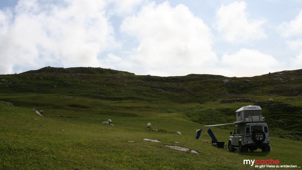 Der Tag begrüßt uns mit Wind und Regen, so dass wir beschließen sofort aufzubrechen. Wir nehmen den schon bekannten Weg zurück bis zur Mitte der Insel bis in die Höhe von Cleascro, dort zweigen wir auf die Route entlang der Nordwestküste ab. Schließlich wollen wir noch die Callanish Stones sehen, bevor wir schon wieder zum Hafen eilen müssen, um die nächste Fähre zu erwischen. Diese bringt uns von Stornoway nach Ullapool auf das schottische Festland, von dort geht es durch die Highlands bis nach Achmelvich, wo wir unser Nachtlager direkt am Atlantik aufschlagen. Um die letzten Sonnenstrahlen des Tages verfolgen zu können, erklimmen wir einige Hügel in unmittelbarer Nähe, welche wir uns mit den dort freilaufendenSchafen teilen.(183 km)