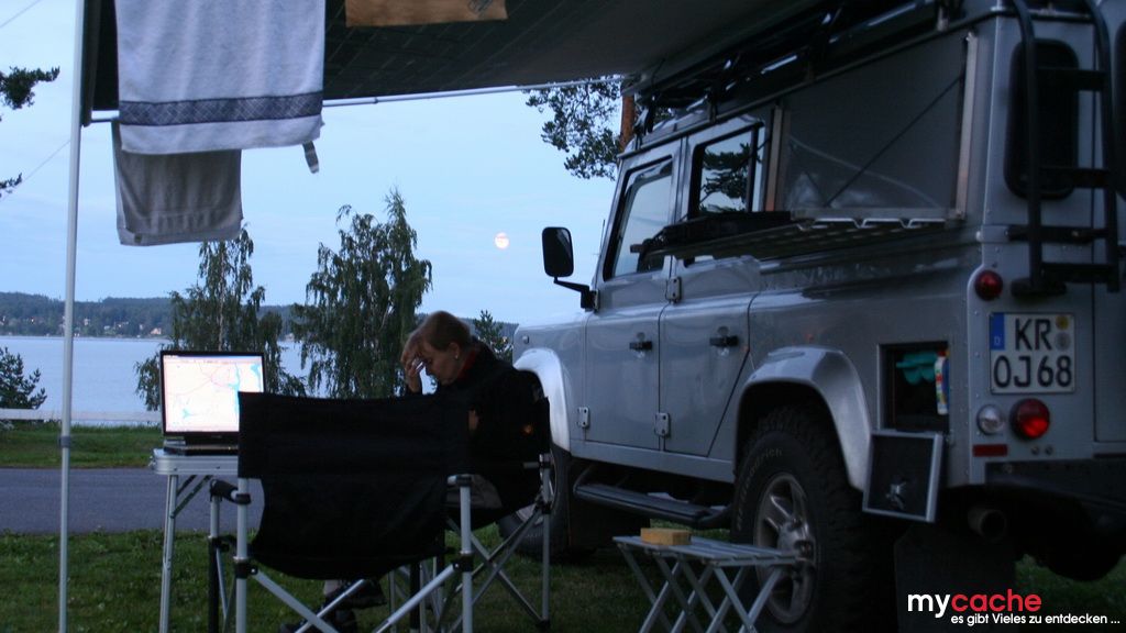 Der Morgen ist genauso verregnet wie die zurückliegende Nacht, daher beschließen wir auf dem direkten Weg über die E4, der Küste entlang, dem Bottnischen Meerbusen, nach Süden fortzusetzen. Auf unserem Weg ergibt sich die Gelegenheit, unsere Ausrüstung beim Outlet von Fjäll Räven zu erweitern. Gegen Spätnachmittag klart das Wetter auf und wir erreichen hinter Sundsvall einen Campingplatz in Terrassenform direkt am Meer und beenden den Tag mit einem wunderschönen Vollmond.