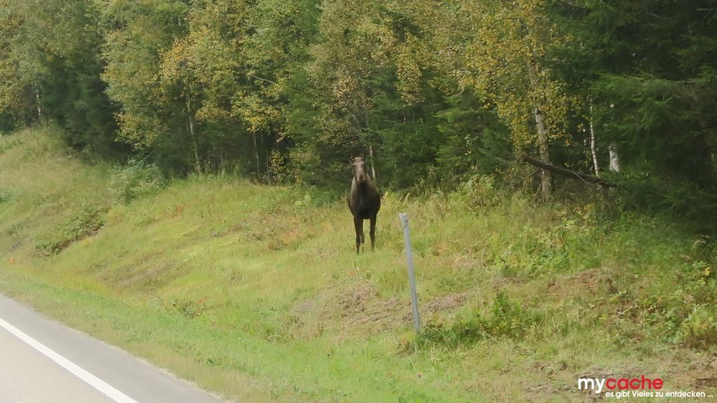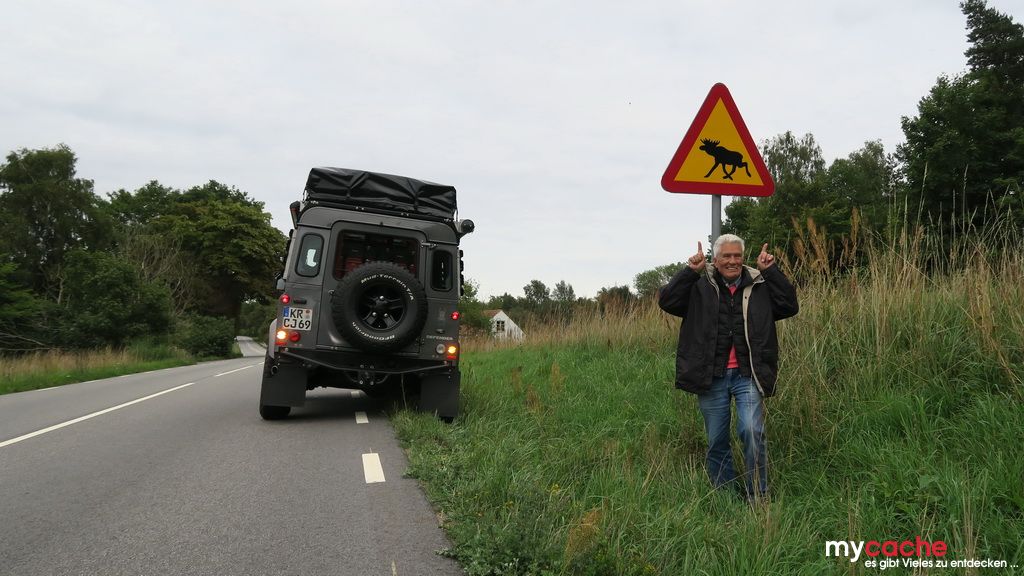 Die Minimierung schreitet voran: weitere zwei Autos mit zweier Besetzung machen sich auf, Schweden zu erkunden. Wir erkunden zunächst die nähere Umgebung und machen uns auf den Weg nach Ales Stena, einem Steinkreis in Form eines Schiffsrumpfes. Auf dem Rückweg sichten wir einen zweibeinigen Elch vor dem entsprechenden Hinweisschild. (70km)