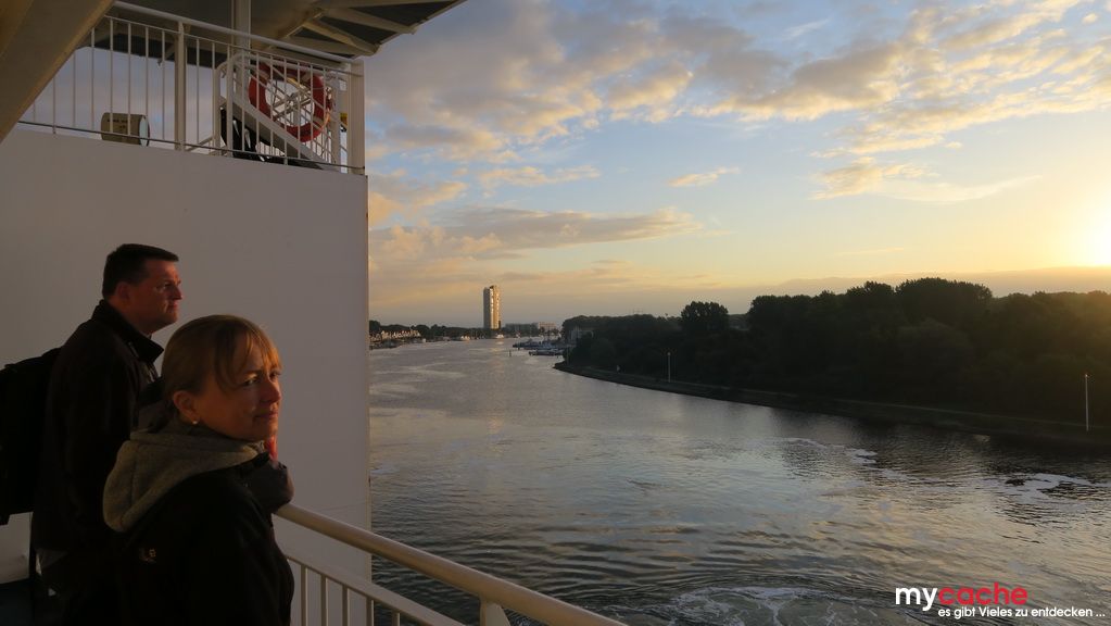 Mit dem Sonnenaufgang erreichen wir den Hafen von Travemünde. Bevor wir etwas Energie zu uns nehmen können, müssen unsere Fahrzeuge betankt werden. Unsere Stärkung nehmen wir im Niederegger Cafe in Travemünde zu uns, dabei betrachten wir das Auslaufen unserer Fähre nach Schweden mit etwas Wehmut. Frisch gestärkt geht es nun Richtung Heimat, wo wir bei der Rheinquerung von einem Sonnenuntergang begrüßt werden. (487 km)